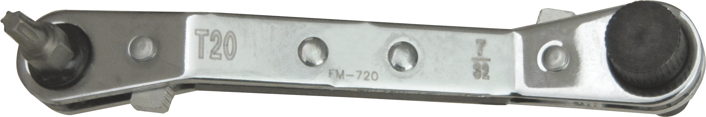 - 25° offset ratcheting dual-end wrench containing a 7/32" six-point (5.5mm), and T-20 TORX® bit.