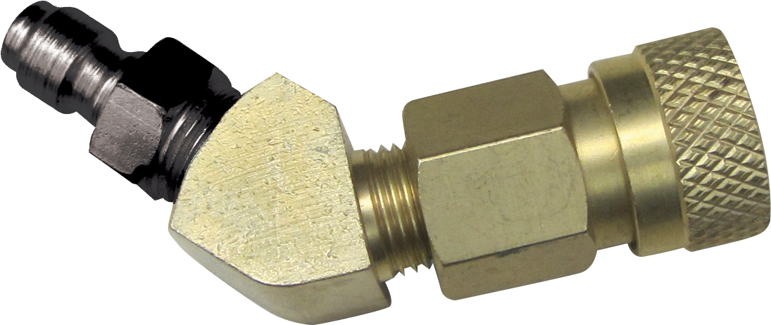 - Straight through adapter with male and female quick couplers on each end of a 45-degree elbow.