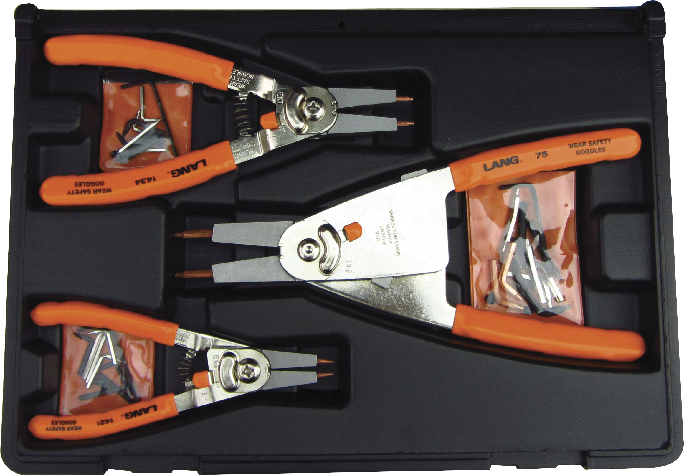 - Contains one each of the 1421 and 1434 models as well as the 75 model (Internal & External Replaceable Tip Retaining Ring Pliers with Automatic Ratchet Lock)